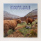 As vacas das terras altas pastam pacificamente num vale luxuoso e prateado rodeado de colinas castanhas avermelhadas. Montanhas com capas de neve enquadram a cena sob um céu azul claro.