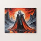 vampiro se posiciona em uma paisagem escura e sombria sob uma lua vermelha, com morcegos voando e castelos ao fundo.
