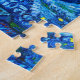 Quebra-cabeça com a pintura a óleo de Vincent van Gogh na Noite Estrelada (1889). Inspirada pela sua estadia num asilo, a arte representa uma aldeia debaixo de um céu noturno de lua azul e amarela e estrelas. Um presente de excelente para fãs do Poste-impressionismo e da arte holandesa.