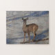 Um veado fêmea parado na neve perto de um riacho em um dia frio de inverno em Nova York.