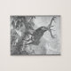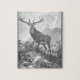 Linda ilustração de cervo preto e branco nas montanhas altas. Um veado macho com galhadas é seguido por dois outros cervídeos ao lado de uma montanha à distância. Por volta de 1890, Thiele