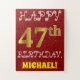 Este quebra-cabeça de aniversário simples e divertido apresenta a mensagem "FELIZ 47.º ANIVERSÁRIO", com o "47.º" a ter uma aparência falsa e imitada de cor dourada. Também apresenta um nome personalizado e um fundo de cor vermelha. Pode ser uma maneira divertida e especial de dar uma saudação de aniversário personalizada a alguém que comemora seu quarenta e sétimo aniversário. [~Z0000200]