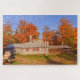 "Vermont Sugar House" por Catherine Sherman. No início do outono, a madeira é empilhada contra uma fábrica de açúcar, pronta para aquecer a seiva da árvore em xarope na primavera. As árvores de caramelo vermelho-claro circundam a casa.