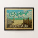 Esta design do cartão postal de Montauk apresenta uma praia arenosa com uma bela água turquesa oceânica e acima do mar, um céu azul com nuvens brancas e onduladas. No estilo viagens vintage.