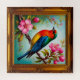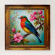 Trabalho de arte de um sabiá colorido que repousa sobre um galho florescente cor-de-rosa, apresentado dentro de um quadro de ouro elegante, representando uma harmonia de arte e natureza.