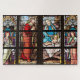 Imagem colorida mostra cena de natividade em vitrines coloridas da catedral.