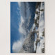 Quebra-cabeça de serra de vaivém da vila pequena Sankt Magdalena no vale de Villnoess com os picos de montanha das dolomites de Geisler no fundo coberto na neve na estação do inverno em Tirol sul, Italia.