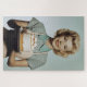 Uma mulher clássica, ao estilo dos anos 50, com curvas glamourosas e um sorriso brilhante, segurando um bolo maravilhosamente decorado, evocando nostalgia e encanto retrô.