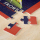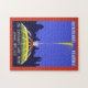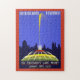Legal Poster vintage Com Buckingham Fountain Chicago. Céu azul vibrante brilhante com luz neonatal fonte em verde, amarelo e vermelho, com linha do horizonte da cidade ao fundo. Posters WPA de Chicago Lakefront