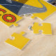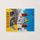 A vibrant vintage travel poster depicting a train crossing a bridge towards a grand cathedral under a bright blue sky with airplanes overhead.