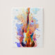 Violão multicolorido cercado por manchas coloridas sobre fundo branco