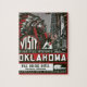O design vermelho e preto do turista do vintage com um poço de petróleo e um chefe indiano junto com a "visita Oklahoma" e "hotel de Rogers"