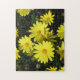 Fechamento da Daisy. Pétalas amarelas com centro laranja, colocadas sobre o fundo das folhas verdes escuras. Várias flores em vários palcos de floração.