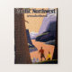 Poster mostrando um homem e uma mulher olhando por cima de montanhas e uma cidade perto da água, de entre árvores de madeira vermelha.