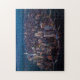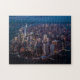 Vista aérea de Manhattan tirada de cima do rio no crepúsculo.