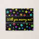 Este design quebra-cabeça multicolorido e divertido apresenta um padrão de formas estelares de vários tamanhos e coloriu uma variedade de cores em um fundo preto. Ele também apresenta a pergunta da proposta de casamento "Você me casado?" na frente em texto amarelo parecido com script. Um quebra-cabeça assim poderia ser uma maneira divertida de fazer uma proposta de casamento para alguém especial.