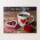 Here is a fun way to propose on Valentine's Day! Do a puzzle together and as it gets put together she or he will see you popping the question! How romantic! The picture if of a red rose, a heart shaped box of chocolates and a cup of warm coffee.