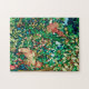 Quebra-cabeça num design de tapeçaria William Morris de uma raposa e faisão em voo num cenário de floresta de fantasia de folhagem verde folha e frutas