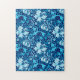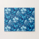 Quebra-cabeça em uma vintage, William Morris impressão floral de lírios estilizados e irlandeses, melhorado digitalmente e colorido, em tons de azul-céu e branco sobre fundo azul-indigo escuro, colorido digitalmente e aprimorado