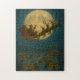Santa’s sleigh soars across a glowing full moon as snowflakes drift over a peaceful village below. The gentle glow of window lights and starlit sky create a timeless image of Christmas wonder and magic.