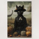 This whimsical Halloween artwork features a stylish black cat dressed as a Victorian witch, surrounded by a quirky array of jack-o'-lanterns under a surreal autumn sky. A perfect blend of spooky and charming, this fantasy print is ideal for Halloween lovers, gothic decor fans, and anyone who enjoys magical realism with a feline twist.