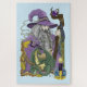 Um mago todo em roxo segurando um funcionarios que tem uma bola de cristal roxo. Um pequeno dragão verde, nó celta funciona, vela e uma borda de outono deixa tudo num pano de fundo azul claro