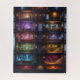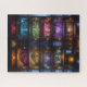 A cross-section of a wizard's tower, with each floor showing a different scene: a potion laboratory, a library, an observatory with a brass telescope, and a dungeon with a sleeping dragon