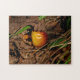 Um cogumelo marrom-alaranjado brota do chão da floresta cercado por uma abundância de folhas marrons mortos. O cogumelo e a grama verde próxima é a única cor entre as folhas do morto. Se você gosta de macrofotografia, nossa Quebra-cabeça de Woodland Mushroom Jigsee é para você. Peça o seu hoje!