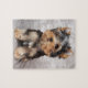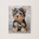 Filhote de cachorro maravilhoso do yorkshire terrier no fundo de matéria têxtil