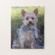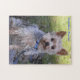 Um retrato de um yorkshire terrier com um colarinho azul e uma trela