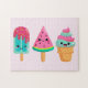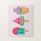 Um quebra-cabeça com uma ilustração de 3 tratamentos de sorvete diferentes. Um picolé azul-esverdeado com gotas de morango e salpicadores coloridos. Um picolé de melancia. Um cone com camadas deliciosas de sorvete em rosa e menta. Todos com sorrisos kawaii fofos.