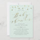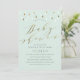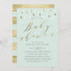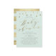Imagine o design de convite para chá de fraldas, moderno e elegante, com gotas de chuva e caligrafia de folha de ouro. Lado de trás com listras de ouro.