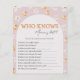 Torne o seu chá de fraldas ainda mais divertido com este cartão de jogo "Quem Conhece Melhor Mamãe?", destinado a combinar a sua coleção "A Little Pumpkin Is On Way" (A Pequena Pumpkin Está a Caminho). Adorado com abóboras e margaridas em tons quentes de outono, este charmoso jogo convida convidados a responder perguntas divertidas sobre a futura mãe! Uma atividade perfeita para uma menina, um menino ou chás neutros em relação ao gênero, e uma forma excelente de juntar todos no riso.