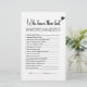 Quem Os Conhece Melhor? Jogo | Casais divertidos Trivia Activity Testa o conhecimento dos seus convidados sobre o casal feliz com o nosso que os conhece melhor? Jogo | Diversão dos Casais Trivia Activity — uma divertida e sincera adição a qualquer celebração de casamento. Com design moderna, tipografia elegante e temas florais ou minimalistas opcionais, este jogo é um favorito em chás de panela, festas de solteira, festas de noivado e chás de casamento. Convidados responderão perguntas divertidas e ponderadas sobre o casal — como "Onde eles se encontraram?", "Quem disse "Eu te amo primeiro?", ou "Qual é a noite do encontro deles?" A pessoa com as respostas mais corretas ganha, e todos saem com boas memórias e algumas surpresas! Você pode personalizar o jogo com os nomes do casal, a data do evento e até personalizar as perguntas para refletir sua única história de amor. Quer seu evento seja temido romântico e floral, moderno e minimalista, ou rústico e botânico, este design ajustado se aplica perfeitamente à sua decoração. Impresso em estoque de cartão de alta qualidade ou disponível como download digital, este cartão de jogo é perfeito para mesas convidadas, para bolsas ou estações de jogos, e adiciona uma vibração e amor à sua celebração. 🖤 Clique em Personalizar agora para criar o seu que mais os conhece? Jogue e traga diversão, risos e um toque pessoal para o seu chá de panela. quem os conhece melhor jogo, trivia do casal chá de panela, atividade do chá de casamento divertido, jogo de perguntas festas de solteira, jogo de jogos de noiva de casais triviais, jogo de chá de panela personalizado, jogo de festa de casamento moderno, jogo de noivas florais imprimível, que sabe o teste de casal, atividade festa de noivado elegante