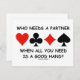 A atitude sugestão e sarcástica Wry ganha vida em qualquer um desses presentes com os quatro trajes de cartas e faz a seguinte pergunta: "Quem precisa de um parceiro quando tudo o que você precisa é uma boa mão?" Presentes para todos os jogadores-ponte que desejam que não precisassem de um parceiro para jogar bridge e que entendem que, por vezes, na mesa-ponte, é preciso uma boa mão para ganhar!