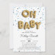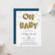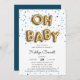 Os únicos convites para chuveiros para bebês apresentam "OH BABY" soletrado em balões de ouro, num fundo de confete azul. Personalize com os detalhes do seu chá de fraldas em letras negras modernas. Convites invertendo a azul marinho sólido.