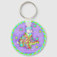 "Sou Cozy no meu Quilt" chaveiro. Este cão branco está embrulhado numa manta de retalhos multicolorida para se manter quente. Ele está vestindo um tobogã listrado. O fundo é roxo com uma borda verde com listras de turquesa. As estrelas e os pontos suspensos são espalhados aleatoriamente no fundo. Este cão vai conquistá-lo com a sua adorável expressão.