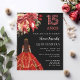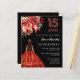 Um convite moderno, na moda e glamouroso para uma Quinceañera, festa de aniversário 15. Um fundo preto, uma menina vestindo um vestido vermelho e dourado, arco vermelho, vermelho e rosa e rosas ouros, florais. O nome é escrito com um moderno estilo escrito à mão. Personalize e adicione os detalhes da sua festa. 1 folha = 1 convite impresso de borda a borda.