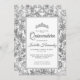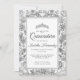 Um convite de festas de Quinceanera preto e branco com coroa princesa. Personalize com seu nome nesta assinatura de script contrastada com a tipografia de texto serif clássica e resistente. Floral no fundo do convite.