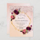 Na frente: Um convite para uma Quinceañera, 15 festa de aniversário. Um rosa dourado, fundo branco cor-de-rosa cor-de-rosa com uma falso estrutura geométrica dourada. Decorados com flores roxas escuras e burgueiras, rosas e penas do estilo "boho". Derramamento de ouro rosa. Modelos para um nome e detalhes da festa. O nome é escrito com um script de estilo manuscrito, letras coloridas de cinza. Traseira: Rosa dourado, fundo de gradiente rosa-claro. Dica: Se você não quiser que pareça um cartão postal, clique em personalizar, vá para o verso e remova o divisor e o carimbo de posto.