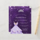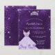 Um convite moderno, na moda e glamouroso para uma Quinceañera, festa de aniversário 15. Um fundo roxo profundo com poeira falsa, tiara e vestido. A cor roxa é irregular. O nome é escrito com um moderno estilo escrito à mão. Personalize e adicione os detalhes da sua festa.