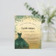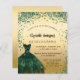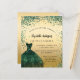 Um convite moderno, na moda e glamouroso para uma Quinceañera, festa de aniversário 15. Na frente: Um fundo de ouro falso com um confete verde, um vestido verde esmeralda. O nome é escrito com um moderno estilo escrito à mão. Personalize e adicione os detalhes da sua festa. 1 folha = 1 convite impresso de borda a borda.