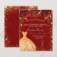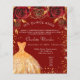 Um convite moderno, na moda e glamouroso para uma Quinceañera, festa de aniversário 15. Um fundo vermelho com pó de ouro falso, um vestido e rosas vermelhas, florais. O nome é escrito com um moderno estilo escrito à mão. Personalize e adicione os detalhes da sua festa. 1 folha = 1 convite impresso de borda a borda.