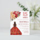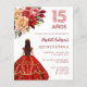 Um convite moderno, na moda e glamouroso para uma Quinceañera, festa de aniversário 15. Um fundo branco, uma garota vestindo um vestido vermelho e dourado e rosas vermelhos, cor-de-rosa e ouro, florais. O nome é escrito com um moderno estilo escrito à mão. Personalize e adicione os detalhes da sua festa. 1 folha = 1 convite impresso de borda a borda.