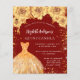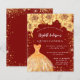 Um convite moderno, na moda e glamouroso para uma Quinceañera, festa de aniversário 15. Um fundo vermelho com poeira falsa dourada, um vestido e ouros, flores. O nome é escrito com um moderno estilo escrito à mão. Personalize e adicione os detalhes da sua festa. 1 folha = 1 convite impresso de borda a borda.