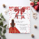 Um convite moderno, na moda e glamouroso para uma Quinceañera, festa de aniversário 15. Um fundo branco com confete, um vestido vermelho e um arco vermelho. O nome é escrito com um moderno estilo escrito à mão. Personalize e adicione os detalhes da sua festa. 1 folha = 1 convite impresso de borda a borda.