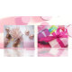 Frente: Um fundo branco decorado com confete vermelho. Personalize e adicione seu nome e datas. Traseira: um vestido vermelho e rosas vermelhas.