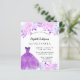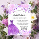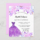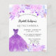 Um convite moderno, na moda e glamouroso para uma Quinceañera, festa de aniversário 15. Um fundo branco com flores cor-de-rosa pinceladas, um vestido de bola roxo. O nome é escrito com um moderno estilo escrito à mão. Personalize e adicione os detalhes da sua festa. 1 folha = 1 convite impresso de borda a borda.