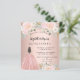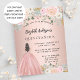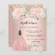 Um convite moderno, na moda e glamouroso para uma Quinceañera, festa de aniversário 15. Um fundo rosa de ouro com flores cor-de-rosa pinceladas, uma garota vestindo um vestido de bola. O nome é escrito com um moderno estilo escrito à mão. Personalize e adicione os detalhes da sua festa. 1 folha = 1 convite impresso de borda a borda.