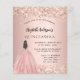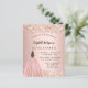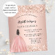 Um convite moderno, na moda e glamouroso para uma Quinceañera, festa de aniversário 15. Um fundo rosa de ouro com poeira falsa de ouro, uma garota vestindo um vestido de bola. O nome é escrito com um moderno estilo escrito à mão. Personalize e adicione os detalhes da sua festa. 1 folha = 1 convite impresso de borda a borda.